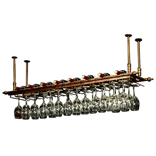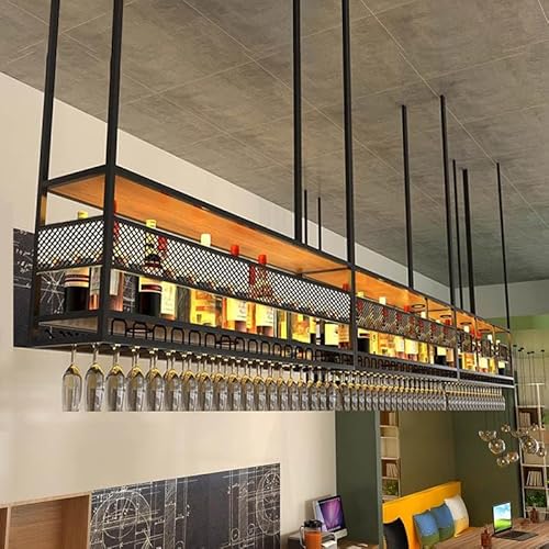 Hängande vinställ i metall, vinglashållare med takmontering, justerbar höjd vinhylla, vinflaskhållare, vintagestil, display, vinförvaringshållare med hylla för höga glas, hylla för bar, restaurang och