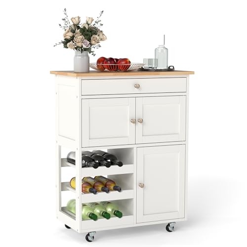 GOPLUS Köksvagn på hjul, serveringsvagn med 1 låda, 2 skåp och vinställ, rullvagn av trä, gummihjul, metallhandtag, i lantlig stil, för kök, restaurang, bar (vit)
