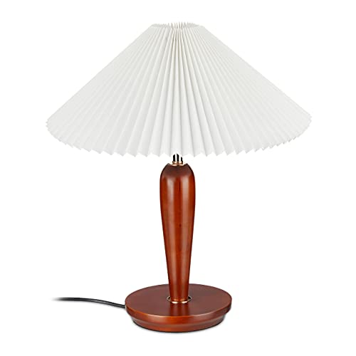 Relaxdays Bord vintage, lampskärm bord med träbas, H x D: 51 x 44 cm, sänglampa, E27-fattning, brun/vit