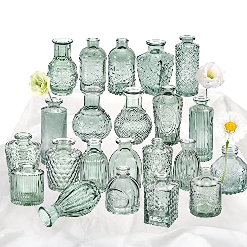 Grönt glas knoppvas set med 22, små vaser för blommor, klara glasvaser för bordsuppsatser, mini knoppvaser i bulk rustika bröllopsdekorationer, bordsuppsatser, vintage look hem bord blomma dekor