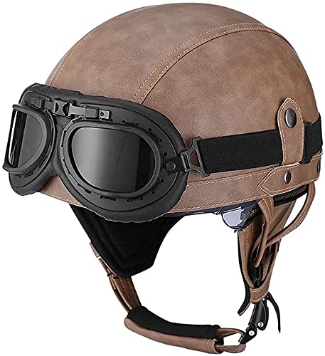 CFZWJ Motorcykelhjälm i retrostil, halvhjälm, unisex, PU-läder, motorcykelhjälmar med vintage-glasögon, årstider, utomhus-åkning, skoter, moped, DOT-godkänd hjälm