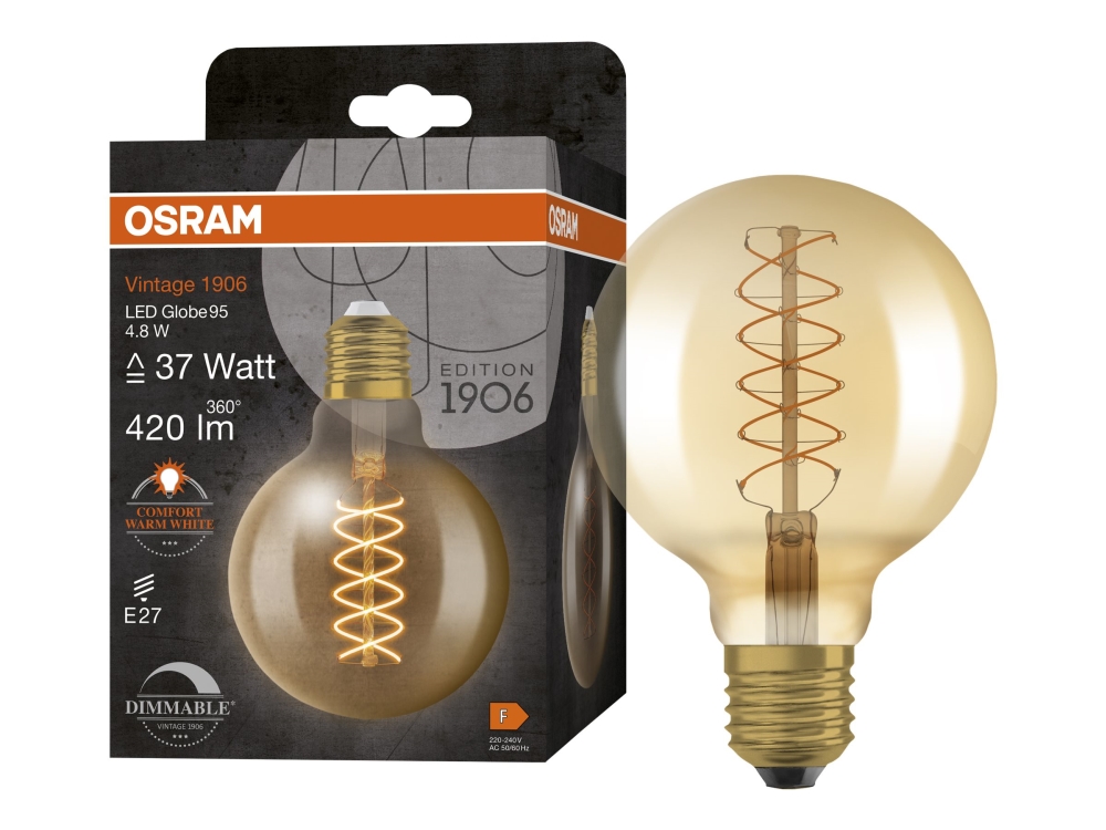 Osram Vintage 1906 - Led-Glödlampa Med Filament - Form: G95 - Klar Finish - E27 - 4.8 W (Motsvarande 37 W) - Klass F - Varmt Vitt Ljus - 2200 K