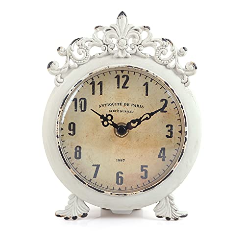 NIKKY HOME Vintage bordsklocka, batteridriven rustik sliten stil, shabby chic heminredning för öppen spis, mantel, hylla, skrivbord, bänkskiva – vit