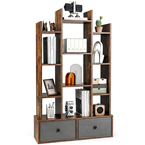 COSTWAY Bokhylla i trädform, stående hylla med lådor, hylla med 12 fack, förvaringshylla för vardagsrum, sovrum, 80 x 24 x 132 cm (vintage brun)