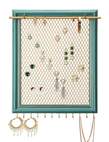 Heesch Hängande örhängesorganiseringsram väggmonterad smyckeshållare vintage rustik stiftörhänge display med avtagbar stång och 12 krokar för halsband, armband och ringar (blågrön)