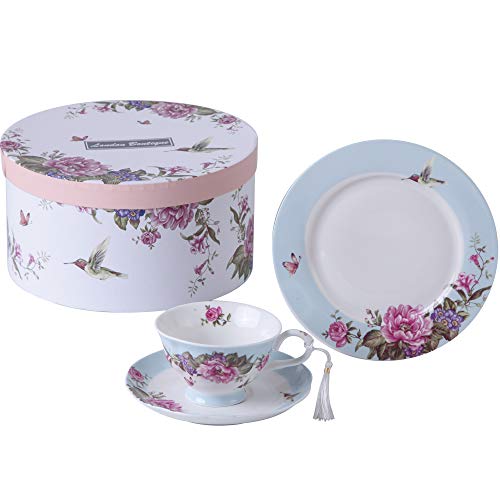 Kaffe tekopp och fat 19 cm desserttallrik set 3 shabby chic vintage porslin fågel fjäril blommig presentförpackning (blå)