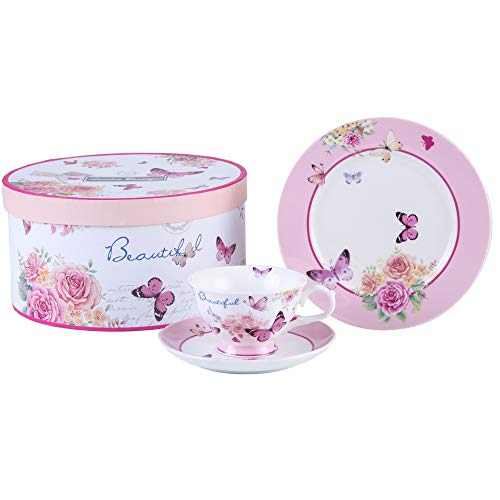 Kaffe tekopp och fat 7,5 tum desserttallrik set 3 shabby chic vintage porslin fågel fjäril blommig presentförpackning (kräm/beige)