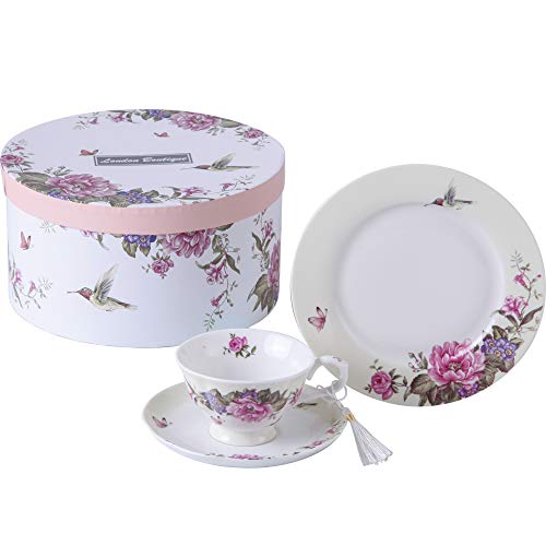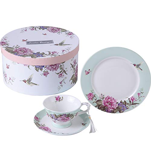 London Boutique Eftermiddagsté set 3 kaffe tekopp och fat desserttallrik shabby chic vintage porslin presentförpackning (fågel ros fjäril)