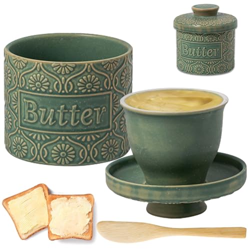 Fransk smörburk, keramisk smörklocka med lock och smörkniv, smörbehållare vattenkyld med vattenlinje, porslin smörkruka vintage-design för smör