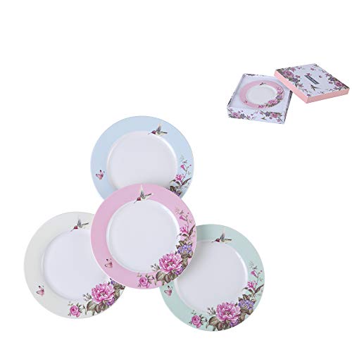 London Boutique porslin sida desserttallrikar 18 cm bred kant shabby chic vintage fågel fjäril blommig set 10 cm presentask (1 set)