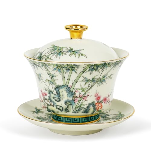 fanquare Kinesiska Gaiwan röda plommon blommor grön bambu porslin Sancai teskål med lock vintage tekopp fat lock set 200 ml