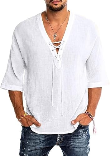 Runcati Linneskjorta herr, kortärmad sommarskjorta, herr, fritidsskjorta med v-ringning, lös passform, vintage, medeltida skjorta, Vit, XL