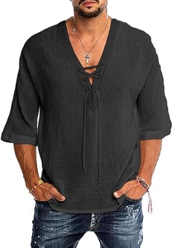 Runcati Linneskjorta herr, kortärmad sommarskjorta, herr, fritidsskjorta med v-ringning, lös passform, vintage, medeltida skjorta, svart, M