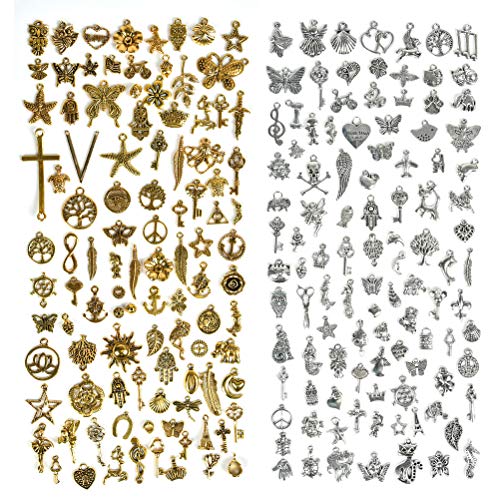 FINEASY Berlocker/hängen, 200 stycken, för armband, blandade berlocker för gör-det-själv-smycken, halsband, örhängen och vintage-pysselprojekt (silver och guld)
