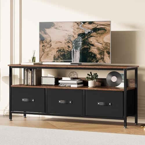 GarveeMore TV-skåp med 3 tyglådor, TV-bänk för upp till 55 tum, TV-skåp i trä med lådor och hyllor för vardagsrum, sovrum, dekoration, 120 x 57 x 30 cm, vintage brun