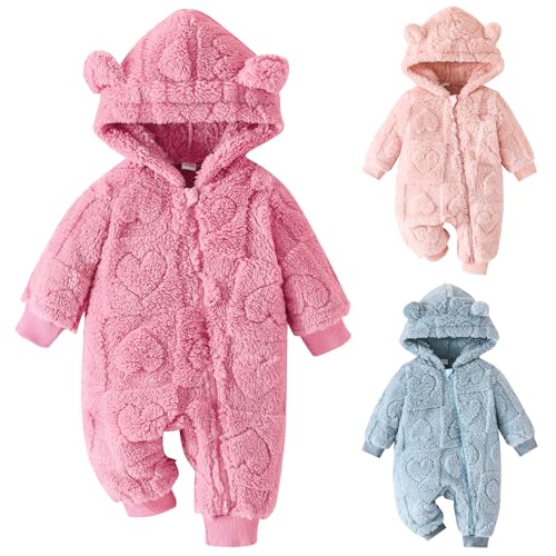 Winmany Nyfödd baby vinter snödräkt björn fleece med huva jumpsuit hjärta sparkdräkt vinterrock ytterkläder för pojkar flickor, Rosa röd, 3-6 månader