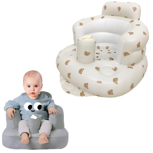 Uppblåsbart säte för spädbarn 4–24 månader med inbyggt luftpump, spädbarn, ryggstöd, soffa, småbarnsstol för att sitta upp, baby duschstol, utomhussäte gåvor för vinter (björn + skydd)