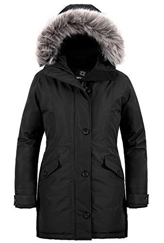 Wantdo Kvinnors vinter varm pufferrock vattentålig utomhusjacka vindtät ytterkläder rock fuskpäls huvjackor, Svart, XXL