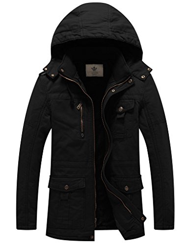 WenVen Herr vinter utomhusjacka varm fleece foder rock huva vindtät jacka medellång ledig ytterkläder kappor, svart, M