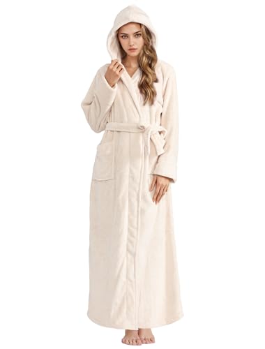 Hellomamma Lång rock med huva för kvinnor lyxig flanell fleece full längd badrock vinter varm pyjamas dusch nattlinne, BEIgE, M