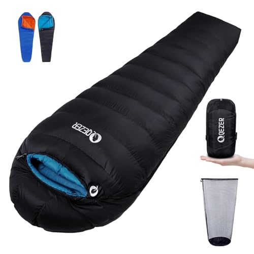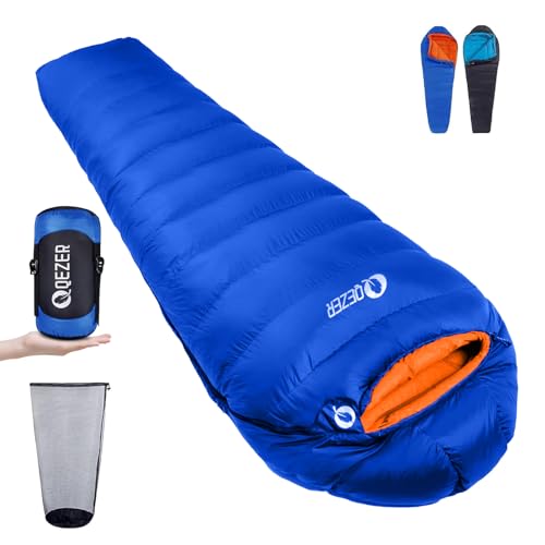 QEZER Sovsäck vinter sovsäck utomhus dunsovsäck 0 °C till -8 °C sovsäck ultralätt sovsäck dun 4 årstider för camping, vandring och vandring (Blå 1000)