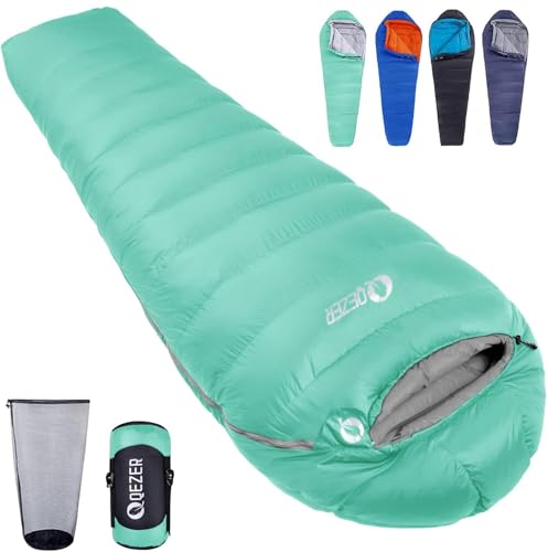 QEZER Sovsäck vinter sovsäck utomhus dunsovsäck 0 °C till -8 °C sovsäck ultralätt sovsäck dun 4 årstider för camping, vandring och vandring (grön)