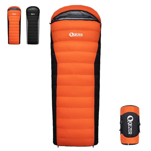 QEZER vinter dunsovsäck Ultralätt sovsäck med Premium Down 12C° till 5C° [1080 g] sovsäck vuxen för camping vandring och vandring utomhus 3-4 säsonger (orange färg)