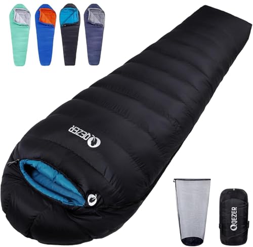 QEZER Sovsäck vinter sovsäck utomhus dunsovsäck 0 °C till -8 °C sovsäck ultralätt sovsäck dun 4 årstider för camping, vandring och vandring (Svart 1000)