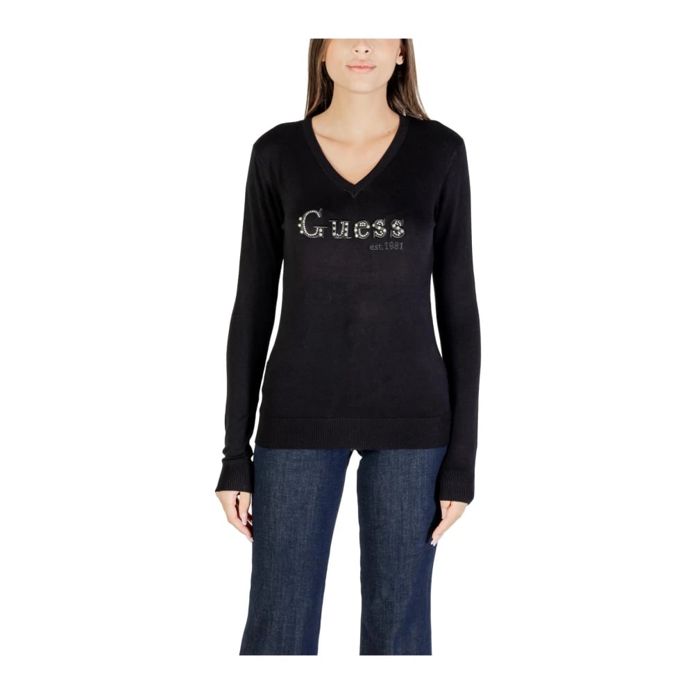 Guess, Stickade Tröjor , Dam, L, Svart V-ringad Stickat plagg för höst/vinter