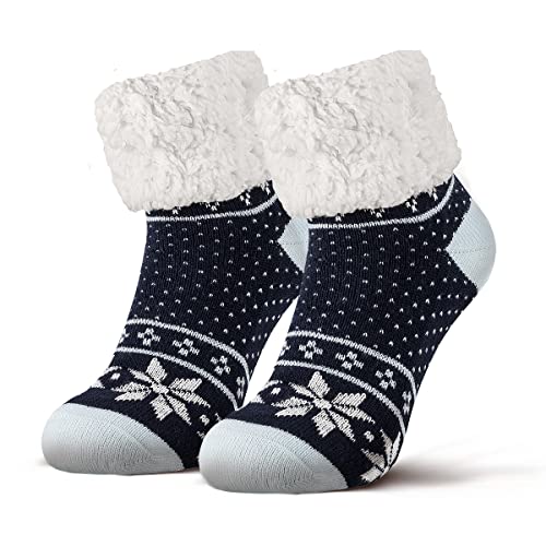 Julstrumpor, älg, varma strumpor, jul, gosiga strumpor, dam, hattstrumpor, julstrumpor med teddyfoder och halkfria noppor, vinterstrumpor för kvinnor och män (mörkblå)