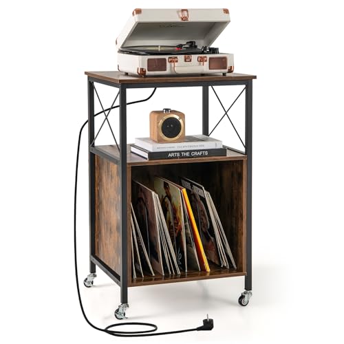 COSTWAY LP-skivor förvaring stativ, skivstativ med integrerad laddningsstation, sidobord trä, skivspelarstativ för vinyl, bruna Records hylla för vardagsrum sovrum