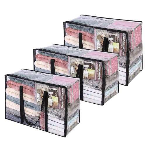 Vieshful 40L/60L/90L Klar förvaringsväska i vinyl för kläder, organisatör med förstärkt handtag, för täcke, filt, sängkläder, genomskinliga rörliga tygkassar med robust dragkedja, 3-pack