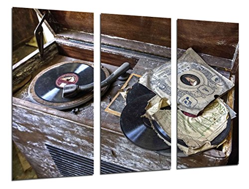MULTI trätryck konsttryck låda inramad bild vägghängande – skivspelare vintage, skivor av vinyl, musik (total storlek: 97 cm x 62 cm), – inramad och redo att hängas – ref. 26460
