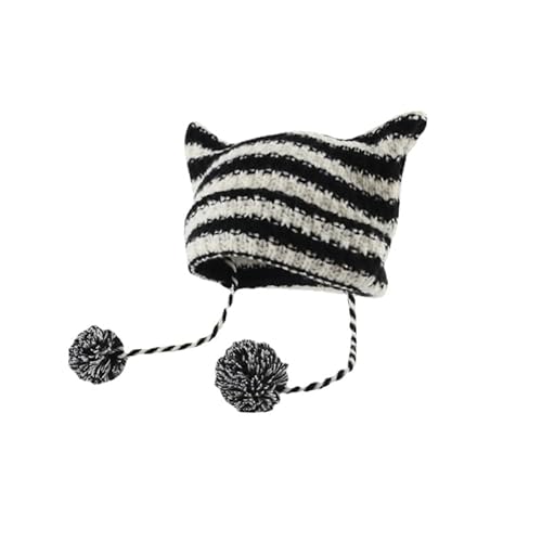 JTMKYO 1 randig kattöronmössa, virkad mössa för kvinnor, mjuk, avslappnad randig mössa, varm kattöronmössa, varm vintermössa, dammössa, plyschstickad mössa (svartgrå), Svart grå, One size/m