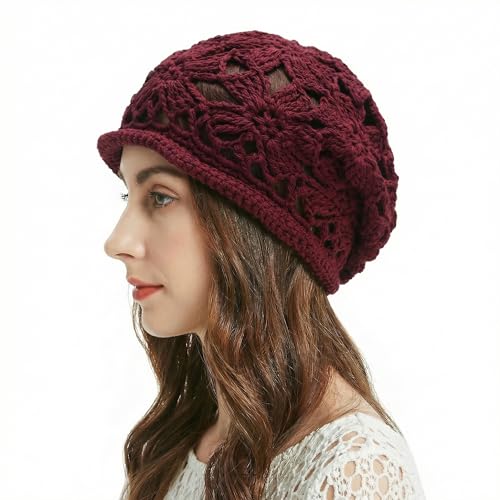 ZLYC Damer sommar stickade mössor handgjord virkad mössa slouch beanie mössa, virkad vinröd, En Storlek