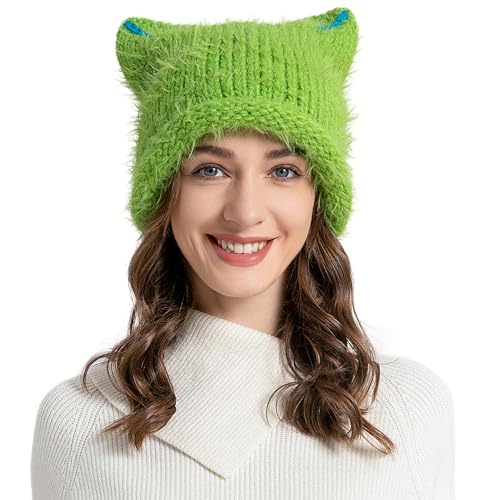 ZLYC kvinnor virkad hatt stickad katt öra slapp mössa söt vintage grunge luddig hatt, Solid neongrön, one size