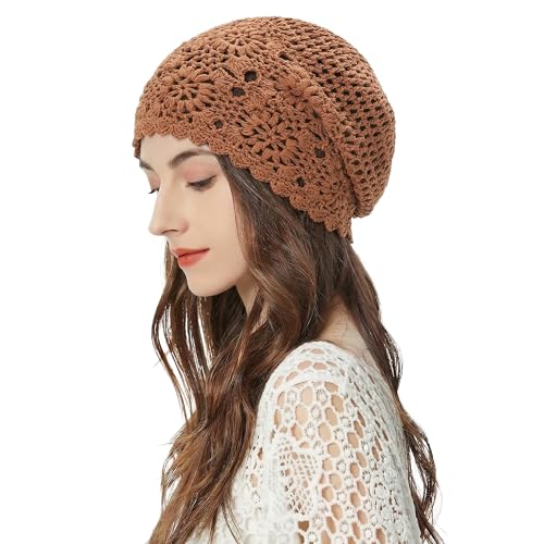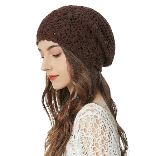 ZLYC Dam bomull virkad slouchy mössa hatt handgjord stickad utklipp sommar blommig skalle keps, Solid brun, en storlek