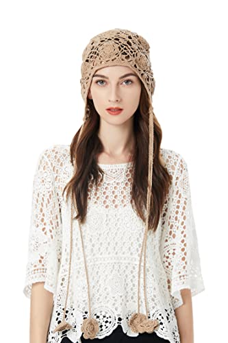 ZLYC kvinnor bomull virkad skalle keps handgjord stickad utklipp blommig mössa hatt, Pärla brun, one size