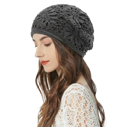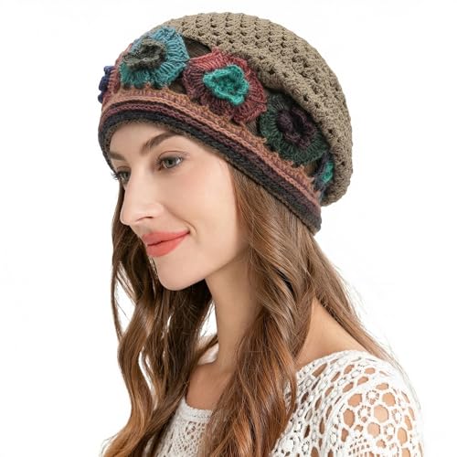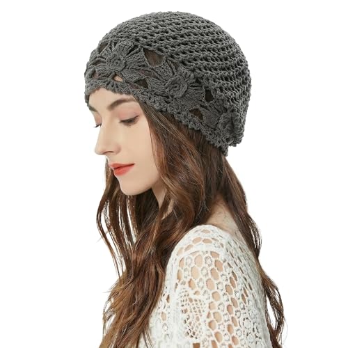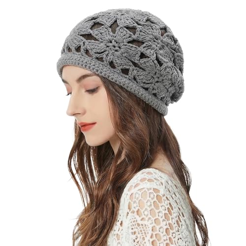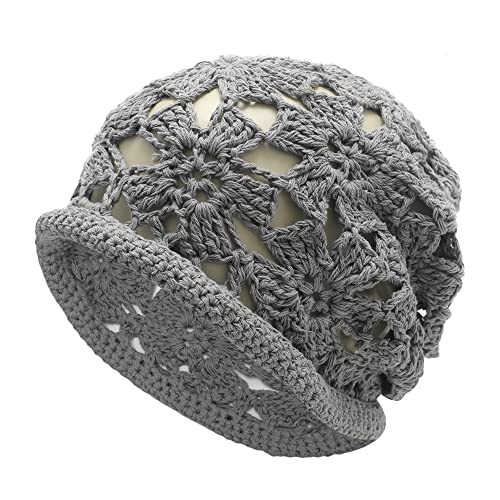 ZLYC Damer sommar stickade mössor handgjord virkad mössa slouch beanie mössa, Blommor grå, En Storlek