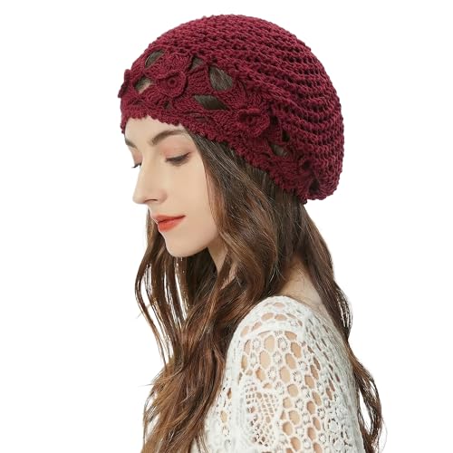 ZLYC Damer sommar stickade mössor handgjord virkad mössa slouch beanie mössa, Blommor vinröd, En Storlek