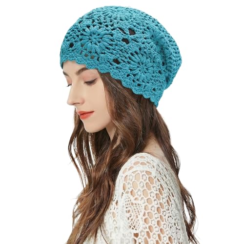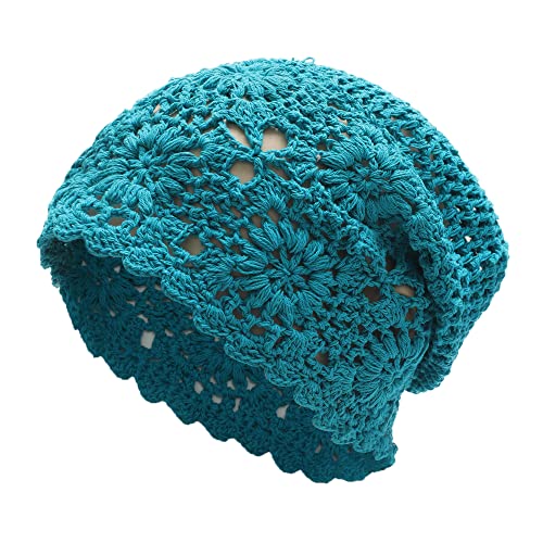 ZLYC Dam bomull virkad slouchy mössa hatt handgjord stickad utklipp sommar blommig skalle keps, Solid påfågel blå, en storlek