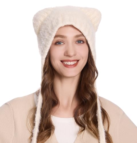 ZLYC kvinnor virkad hatt stickad katt öra slapp mössa söt vintage grunge luddig hatt, Björnöron beige, one size