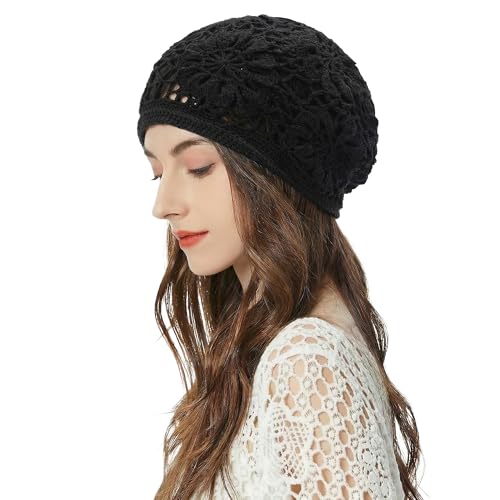 ZLYC Damer sommar stickade mössor handgjord virkad mössa slouch beanie mössa, Svart stickad, En Storlek
