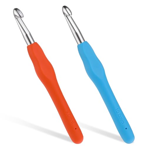2 stycken virknålar, 9,0 mm, 10,0 mm virknålar, sticknålar med ergonomiskt handtag för artros händer, färgglada TPR-handtag, virknål för nybörjare och virkgarn