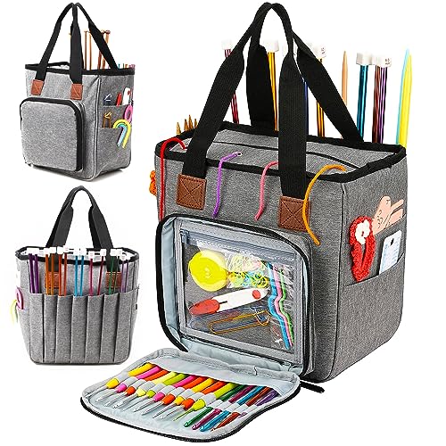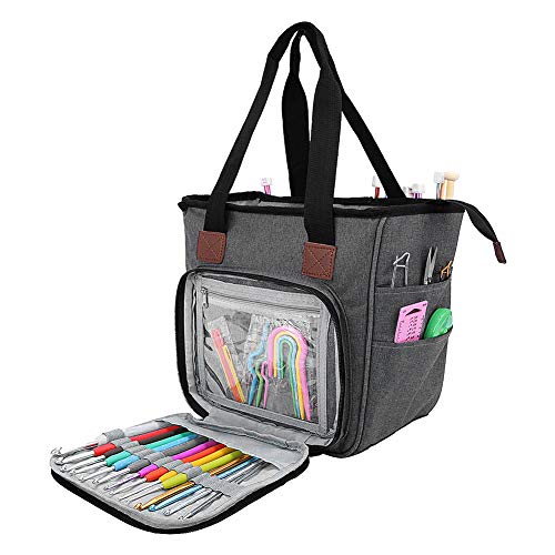 JOZEA Förvaringsväska för stickprojekt, organisatör för garn, virknålar, sticknålar, handgjord väska för stickning (avancerad grå)