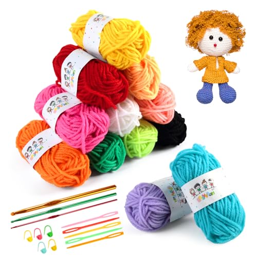 Virka för nybörjarset, 12 x 10 g polyester tjockt garn, 12 färger regnbågsvirkgarn med 3 virknålar, stickade och virkade garn för gör-det-själv-hantverk, husdjurskläder, hattar, handdukar