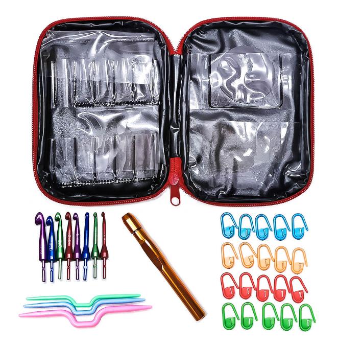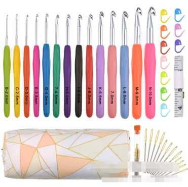 Set med virknålar, 14 st mjuka handtag sticknålar kit + 10 st virkade lås + 9 stora ögon hand sykrokar + 1 152 cm mått+virknålsfodral, idealisk