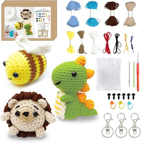 3 virkset för nybörjare djur virka stickning för nybörjare set med virknålar garn och video kreativt stickset pysselset med 3 hummerkrokar för vuxna barn gåva (igel/bin/dinosaurier)