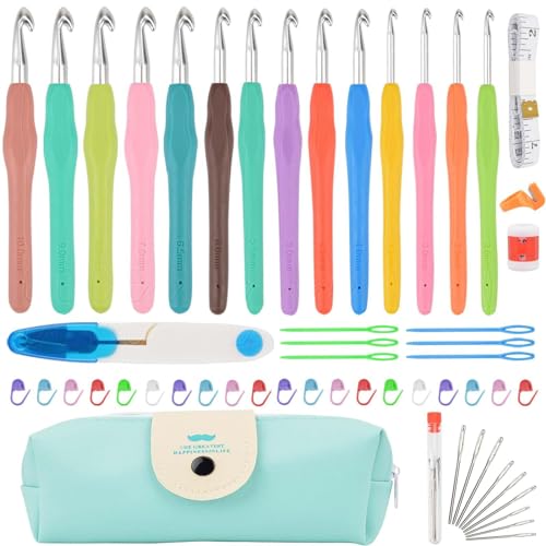 OWill 61 stycken virknål-set, virkset för nybörjare och vuxna, virkade sticknålar set förvaringsväska och tillbehör, ergonomiska virknålar för artritiska händer