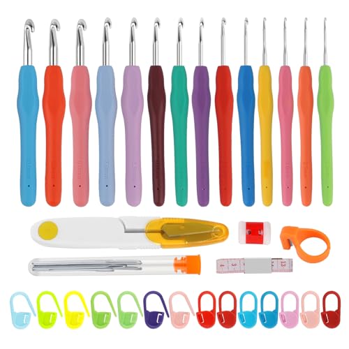LWMLWM 14 stycken virknålar set i full storlek, 44 stycken virkset för nybörjare med virkade tillbehör, ergonomisk virknål mjukt gummi hacknål virkkrokset (2,0 mm – 10,0 mm)